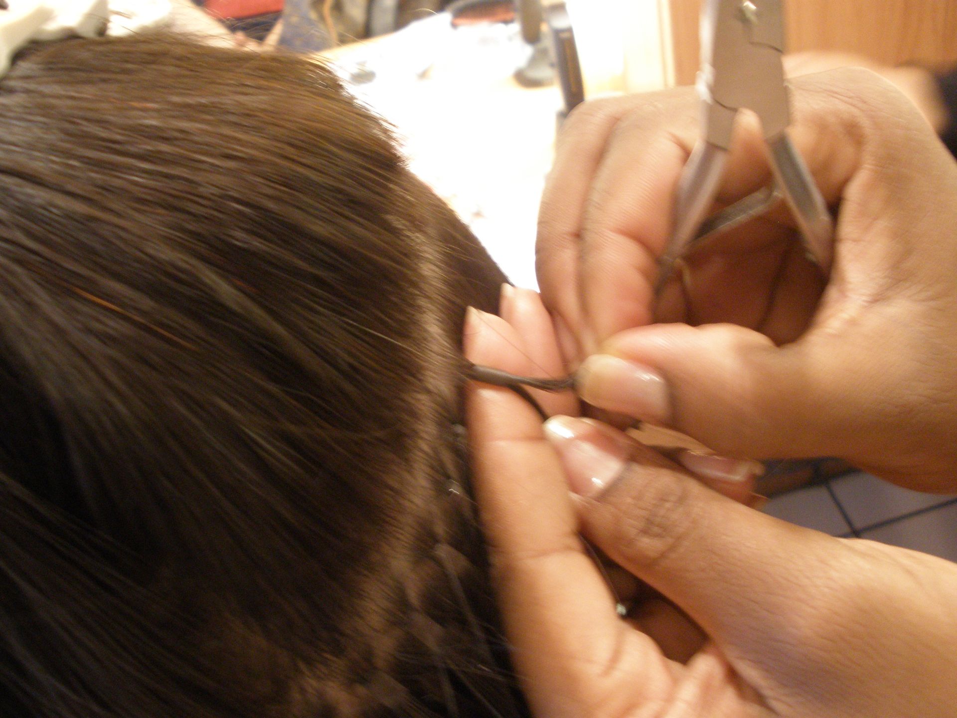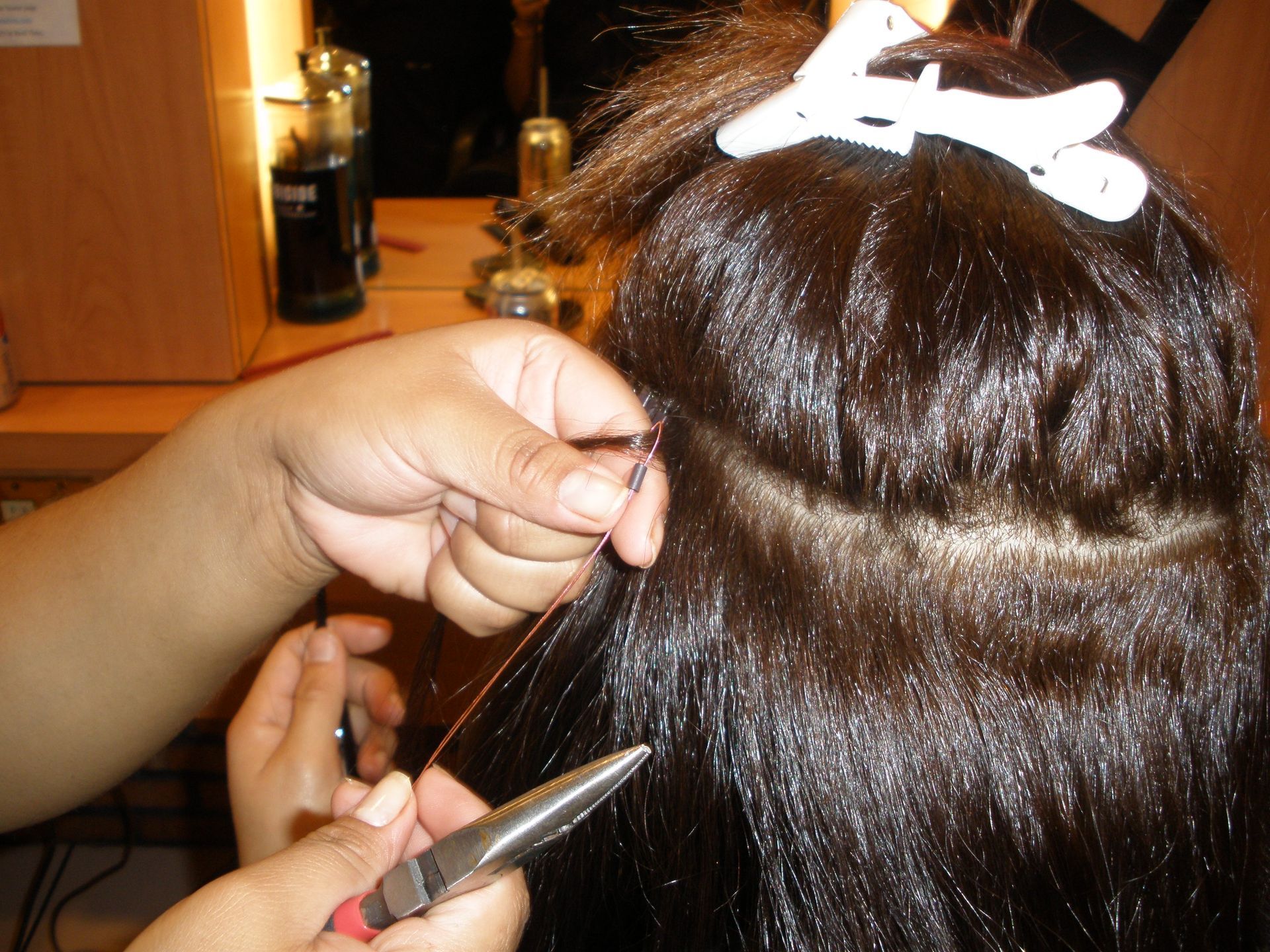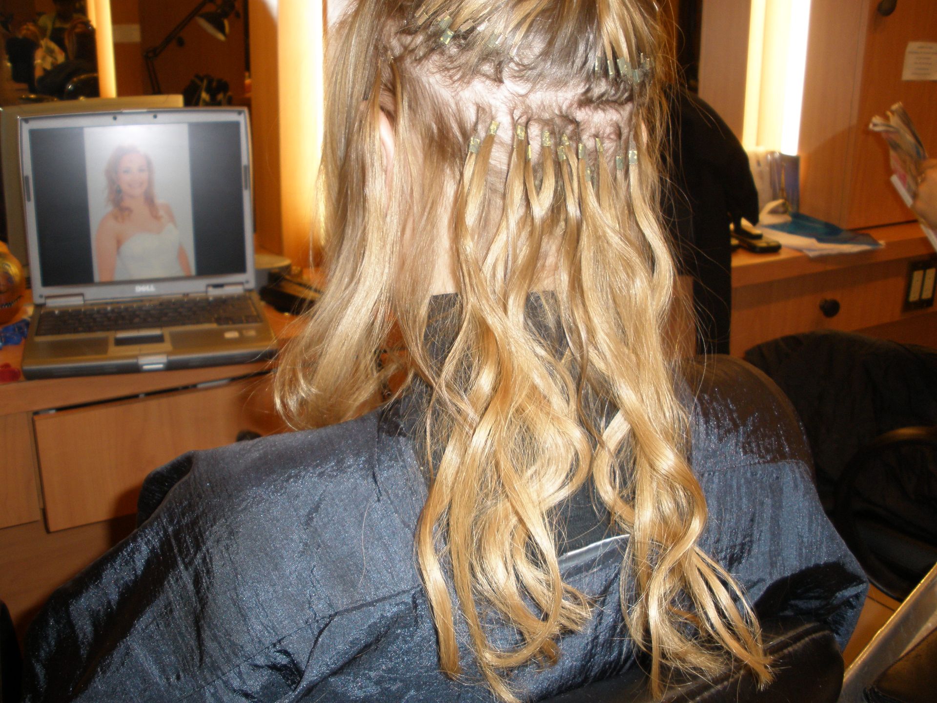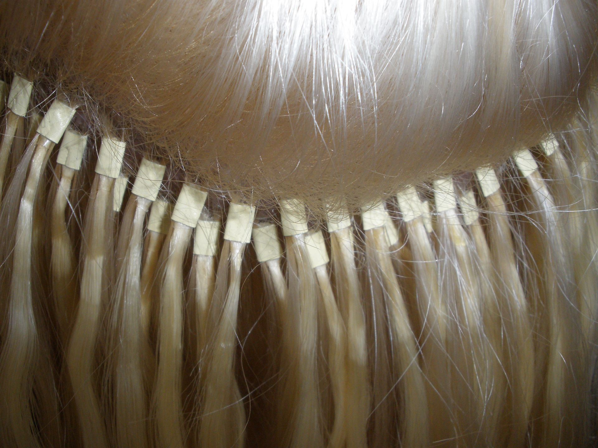A method that is used for temporary extensions when you want to add length or volume for a few days or for a special occasion. This method works well for creating an up-do on someone with short or medium length hair. Your new hair is on a weft (hand knotted on a length of mesh fabric). Sections of the weft are attached in a row directly to your hair with special hair glue. This allows the hair to lie flat on the head. This method will last until your next shampoo and pieces can be removed with any oil base product or bond remover.