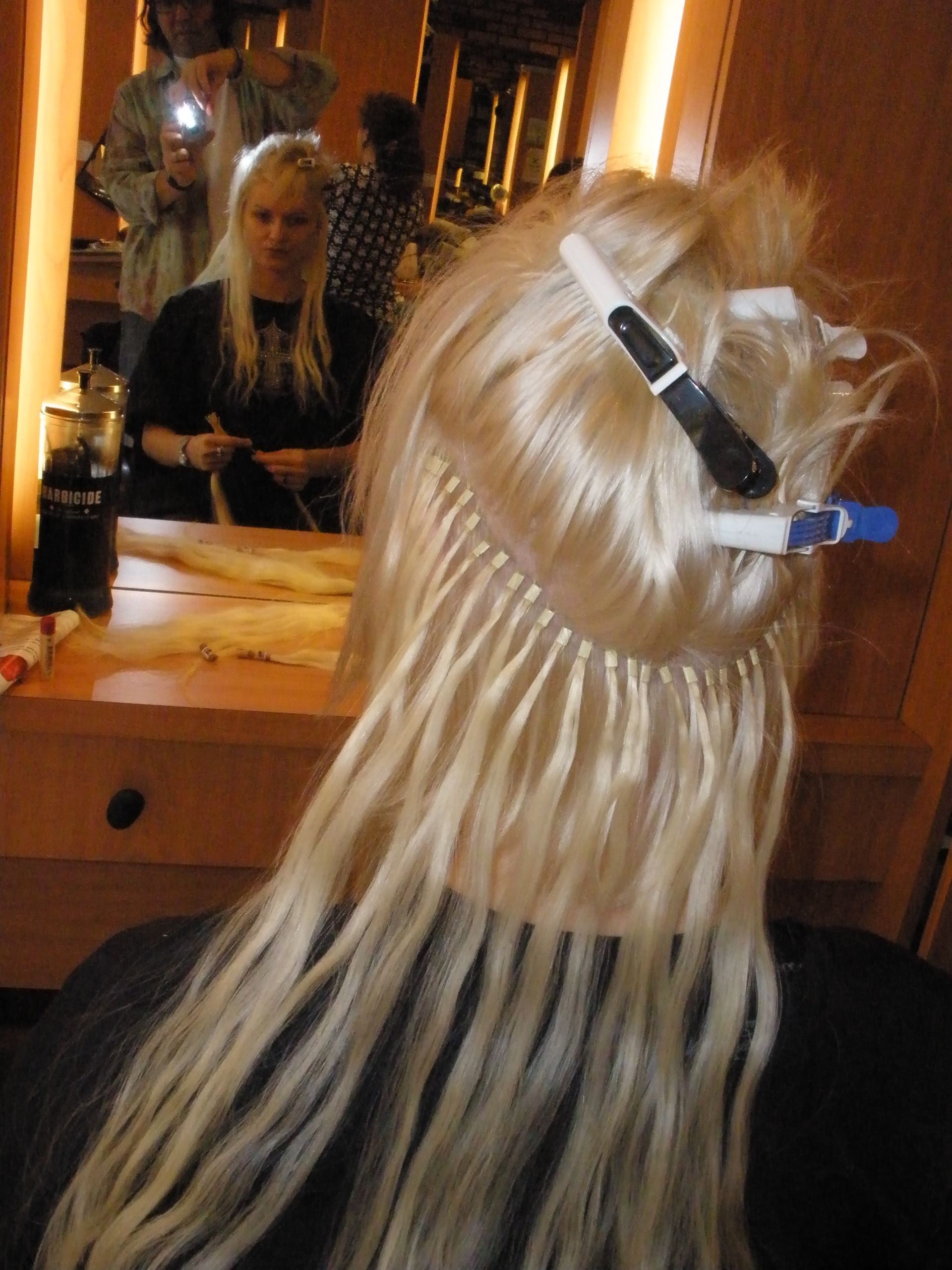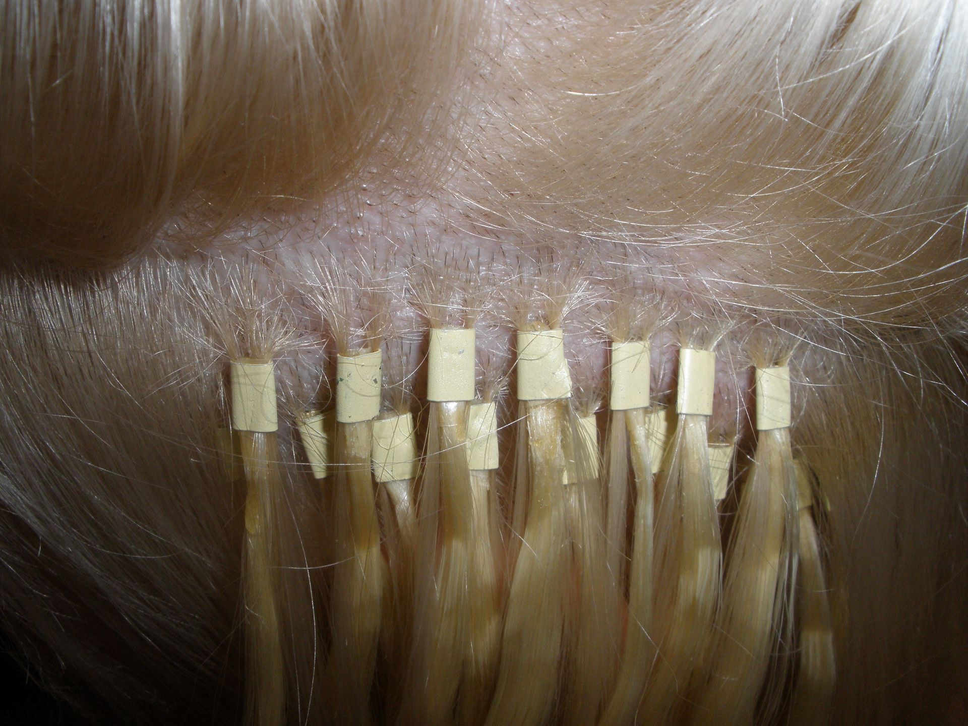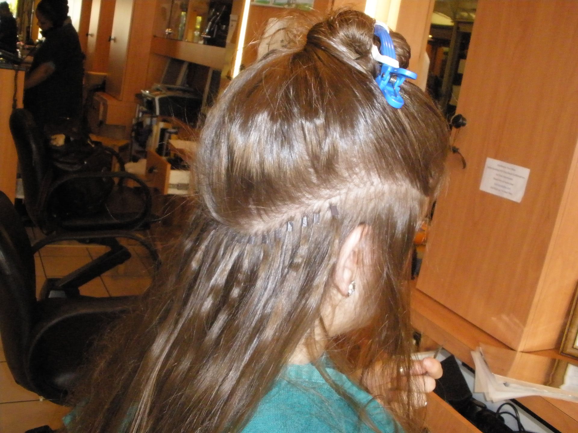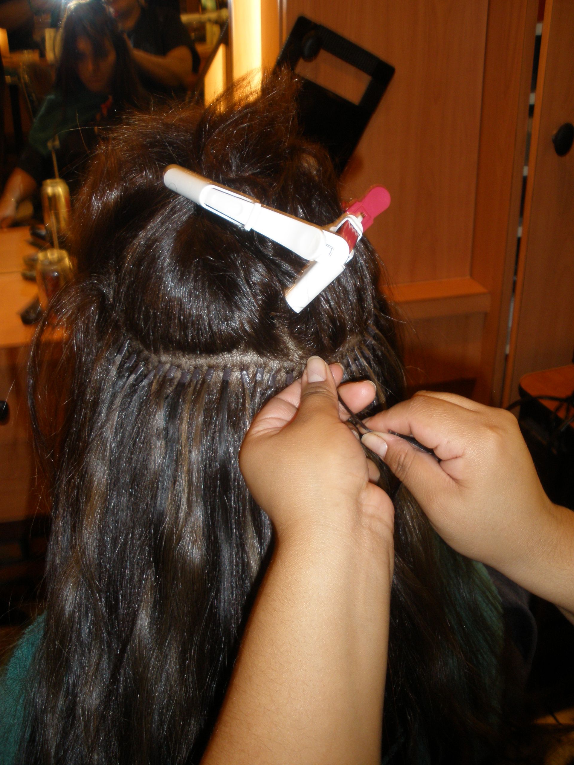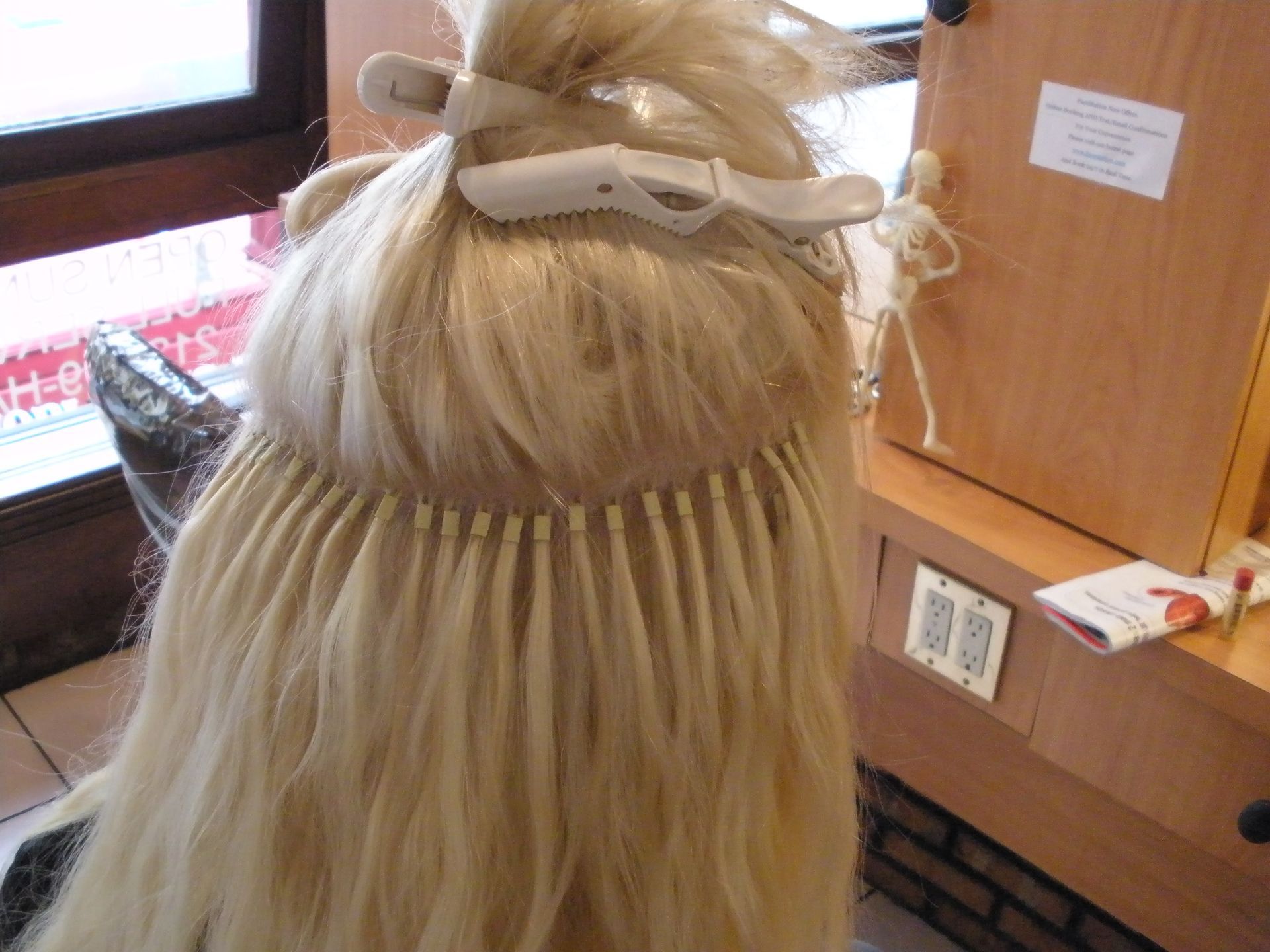 A method that is used for temporary extensions when you want to add length or volume for a few days or for a special occasion. This method works well for creating an up-do on someone with short or medium length hair. Your new hair is on a weft (hand knotted on a length of mesh fabric). Sections of the weft are attached in a row directly to your hair with special hair glue. This allows the hair to lie flat on the head. This method will last until your next shampoo and pieces can be removed with any oil base product or bond remover.