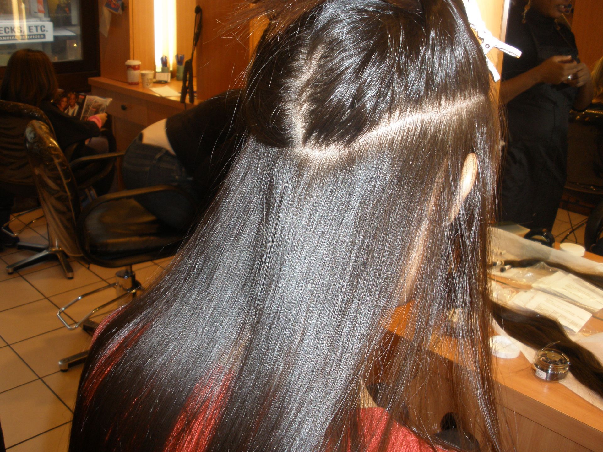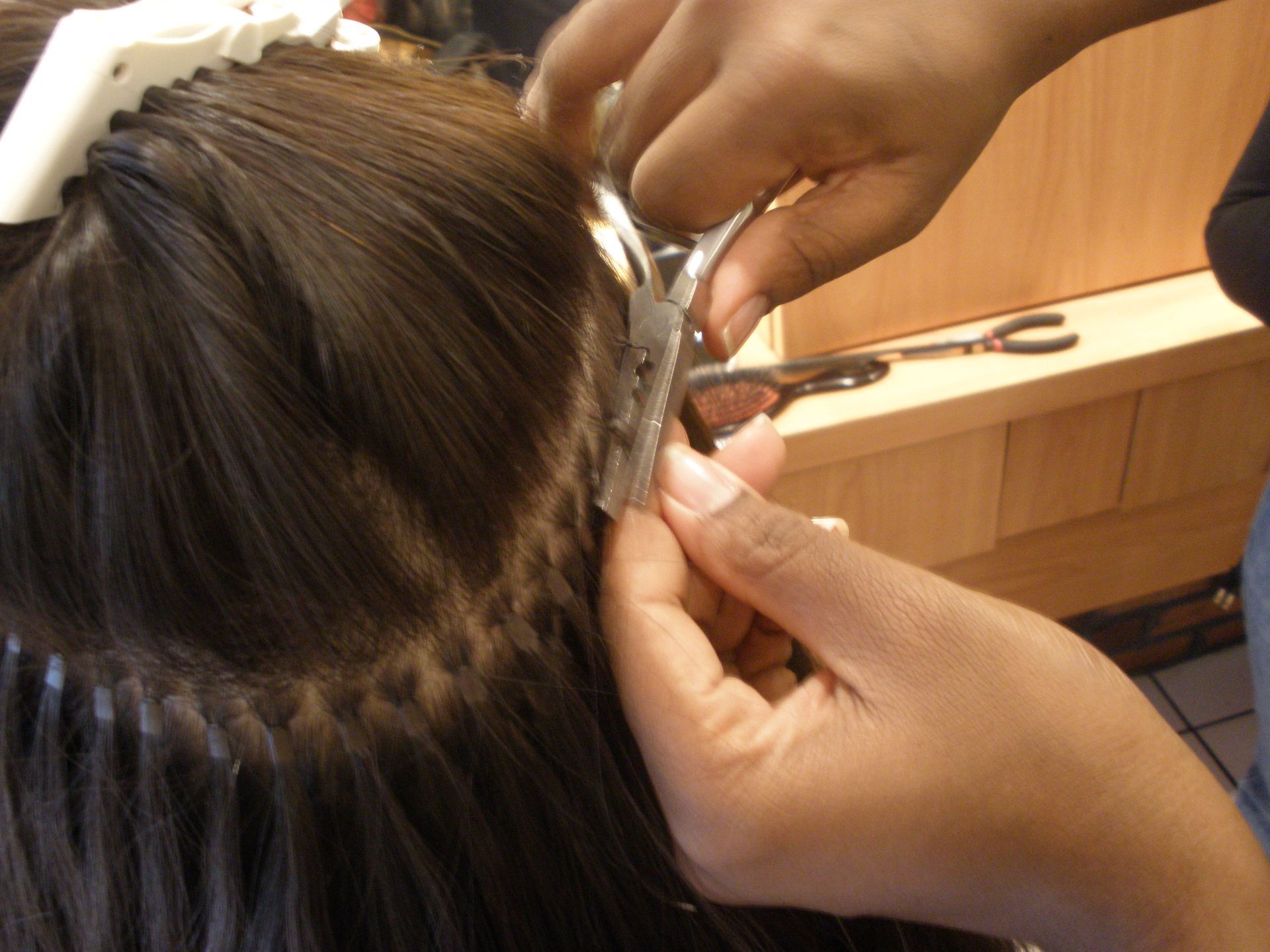 For people who want to add length or volume to their hair for approximately 4 to 8 weeks. It is a great way to try out long hair while you grow out your own. Small cornrows are braided into your hair and then a weft of hair is sewn with a needle and thread to the braids. These extensions can be washed and styled like your own hair. Sewn-in extensions should be removed by your stylist for best results.